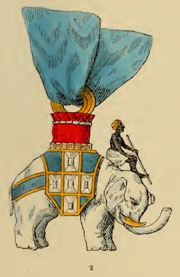 The badge of the Order (No. 2) is a white enamelled elephant with golden tusks, a blue cloth covering, a battlemented tower upon his back, and a negro upon his neck with a spear in his hand.